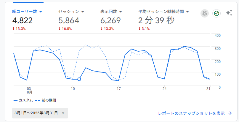 ▼8月の結果。お盆時期にもあり、低下気味です。