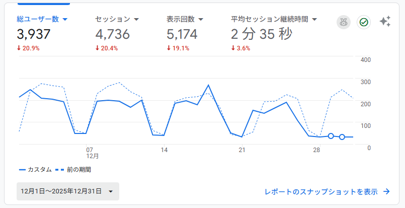 お送りいただいたGoogleアナリティクスのデータにある通り、12月はさらなる「減少」を記録しました。