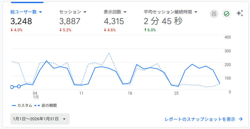 2026年最初の運営報告をさせていただきます。 1月は年末年始の長期休暇もあり、WEB集客の数字としてはまだ「冬眠期間」から抜け出す準備段階といった内容になりました。