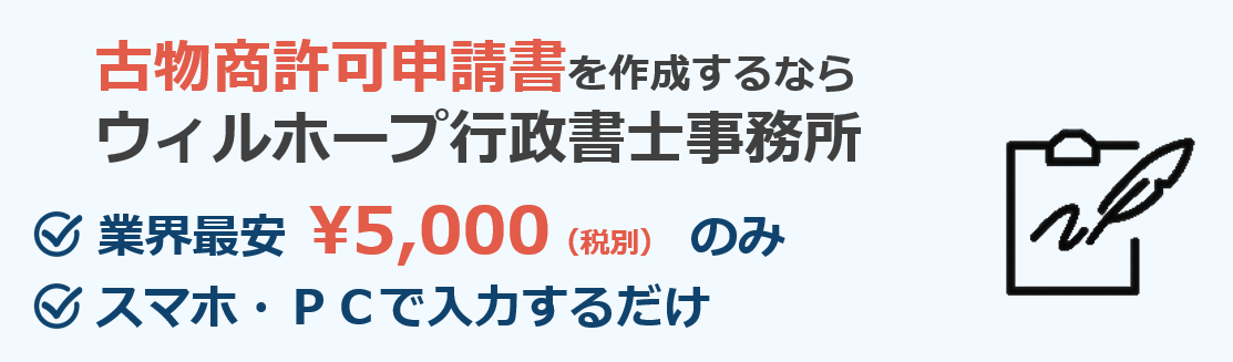 行政書士への依頼費用の相場は5万~10万円と言われておりますが、ウィルホープでは申請書作成がなんと5千円(+消費税)!追加の費用は一切発生いたしません!弊社代表が過去膨大な古物商許可申請の実績から考えぬいたサービスです。