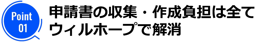 ウィルホープの書類の作成は必要項目にご入力後2営業日以内に書類を作成いたします。出来上がったものをお客様自身で提出するだけなのでスピーディです。また料金も低価格で利用できます。